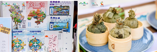 蕪湖書房·鐘書閣、蕪湖書房·科技書院、耿福興小吃、 蕪湖鐵畫等30 余家文旅企業(yè)在展覽現場“ 開市”,品牌展位間