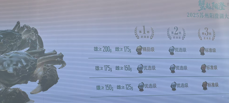值得注意的是,今年《蘇州陽澄湖大閘蟹質量等級》標準正式出爐,規(guī)定了陽澄湖大閘蟹的質量要求、等級評定指標、檢驗方法、評定程序、等級分類等。結合重量、肥滿度等指標,將陽澄湖大閘蟹劃分為精品級、優(yōu)先級、標準級三個等級,為陽澄湖大閘蟹的品質判定提供了更明晰的依據。