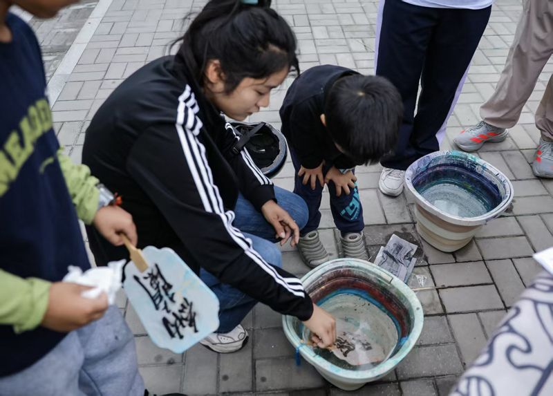 9月27日,海淀上莊鎮(zhèn)納蘭文化公園,“紀(jì)念納蘭性德誕辰370周年”納蘭雅集活動(dòng)舉辦,活動(dòng)包括“非遺文創(chuàng)市集”與“雅集文藝表演”,分別在納蘭文化公園與東岳廟前廣場(chǎng)同步進(jìn)行。圖為小朋友在非遺文創(chuàng)市集上體驗(yàn)油扇制作。