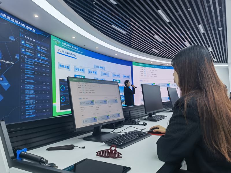 內(nèi)蒙古數(shù)據(jù)交易中心大樓里,工作人員正在介紹算力交易的情況。新京報記者 周懷宗 攝
