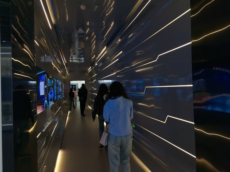 走進(jìn)這座創(chuàng)新空間,在天高云淡的北方秋季,不再是草長鶯飛的草原景色,聲光電織就的科幻空間迎面撲來,一條長長的黑色走廊中,上下四方被金色的光帶貫穿,仿佛穿越到了未來時空。