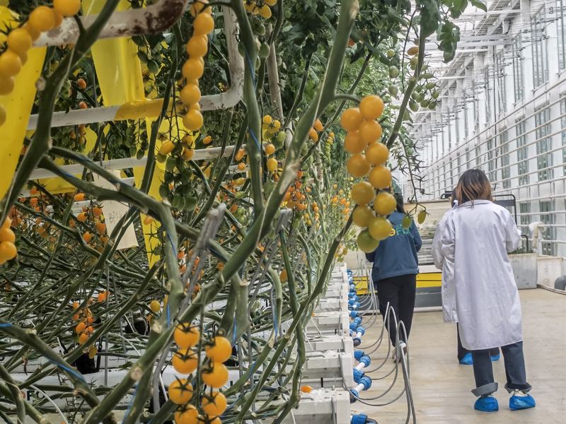 農(nóng)業(yè)產(chǎn)業(yè)園區(qū)中,工作人員正在準(zhǔn)備采收成熟的櫻桃番茄。新京報(bào)記者 周懷宗 攝