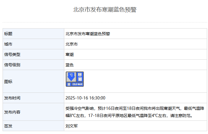 新京報訊 據(jù)北京市氣象局網(wǎng)站消息,北京市發(fā)布寒潮藍(lán)色預(yù)警:受強(qiáng)冷空氣影響,預(yù)計16日夜間至18日夜間北京市將出現(xiàn)寒潮天氣,最低氣溫降幅8℃左右,17-18日夜間平原地區(qū)最低氣溫降至4℃左右,請注意防范。