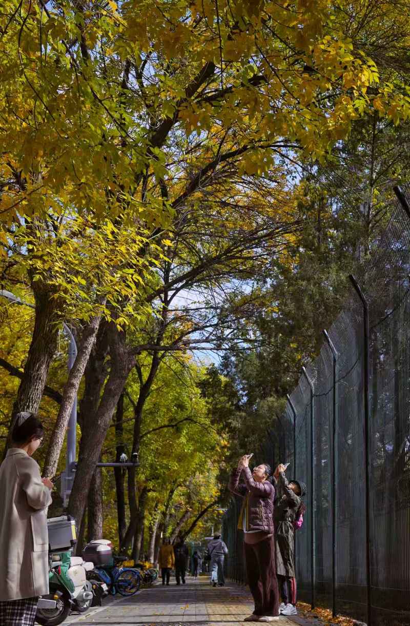 10月20日,三里屯西五街,市民、游客在金黃的白蠟樹下游玩、拍照。