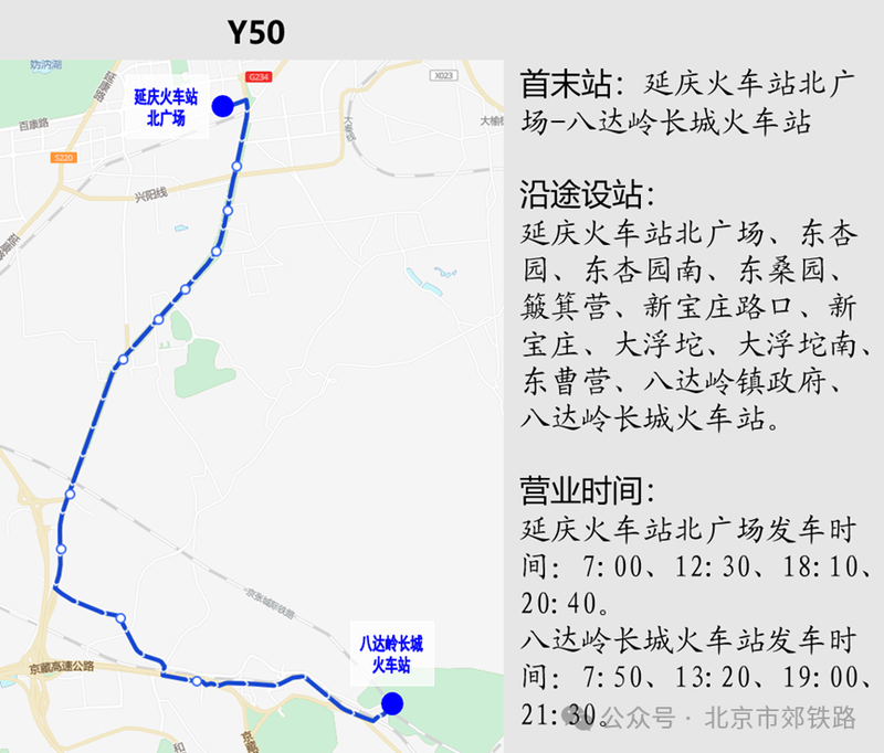 為方便乘客出行,將采取以下配套措施:公交部門(mén)將結(jié)合客流情況做好南口站周邊公交接續(xù)服務(wù),同時(shí)在早晚高峰時(shí)段加開(kāi)880專(zhuān)(延慶火車(chē)站北廣場(chǎng)→地鐵朱辛莊站/朱辛莊公交場(chǎng)站→延慶火車(chē)站北廣場(chǎng))、919地鐵接駁專(zhuān)線(體育場(chǎng)小區(qū)-地鐵昌平西山口站),方便乘客快速換乘城市軌道交通。鐵路部門(mén)將根據(jù)乘客出行需求,合理增加京張高鐵延慶線及八達(dá)嶺長(zhǎng)城站的運(yùn)力,乘客可乘坐接駁公交往返八達(dá)嶺長(zhǎng)城站和延慶站。