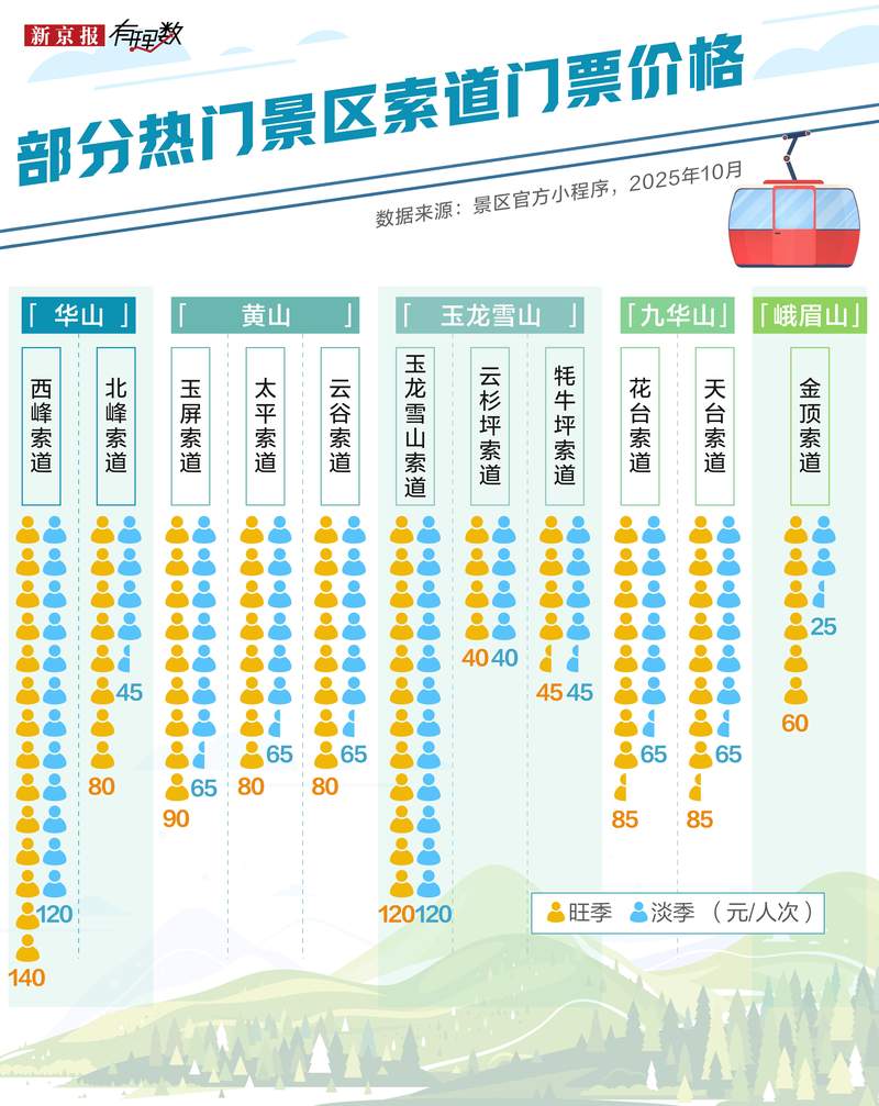 我們觀察了國內(nèi)比較有名的景區(qū)索道單趟價(jià)格,發(fā)現(xiàn)華山西峰索道旺季要140元一人次,是幾個(gè)名山中最貴的;峨眉山金頂索道淡季25元一人次,相對(duì)親民便宜些。