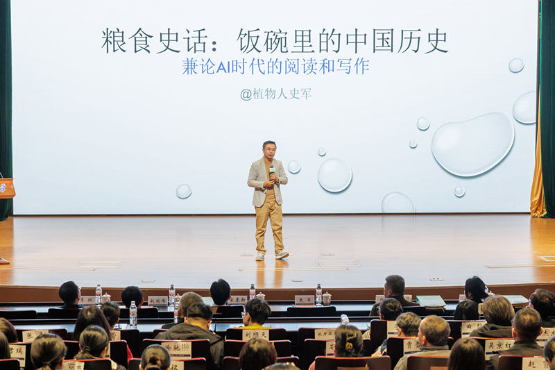 作為植物學(xué)科普博主,史軍著有《中國食物·糧食史話》《中國食物·蔬菜史話》《中國食物·水果史話》《植物塑造的人類史》等書。在當(dāng)天的講座中,從糧食到AI時代的閱讀和寫作,史軍也將閱讀與科學(xué)研究相結(jié)合,由淺入深地講述糧食的歷史,帶學(xué)生們分辨“五谷雜糧”,走近科普工作者的工作與生活。