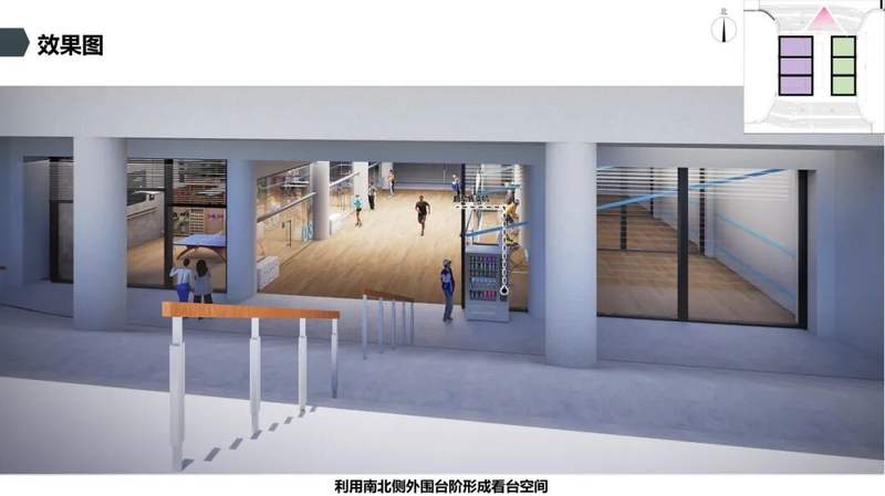 另一大亮點設(shè)施——下穿通道體育場地,則創(chuàng)新性地利用城市客廳B公建北區(qū)的隧道空間,實現(xiàn)城市閑置空間的高效再利用。該場地將建設(shè)3塊標(biāo)準(zhǔn)壁球場和3塊封閉乒乓球場。