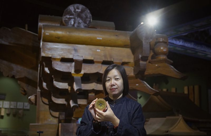 北京古代建筑博物館游覽文物保護與發(fā)展部高級工藝美術師周海榮展示天宮藻井冰箱貼。新京報記者 薛珺 攝