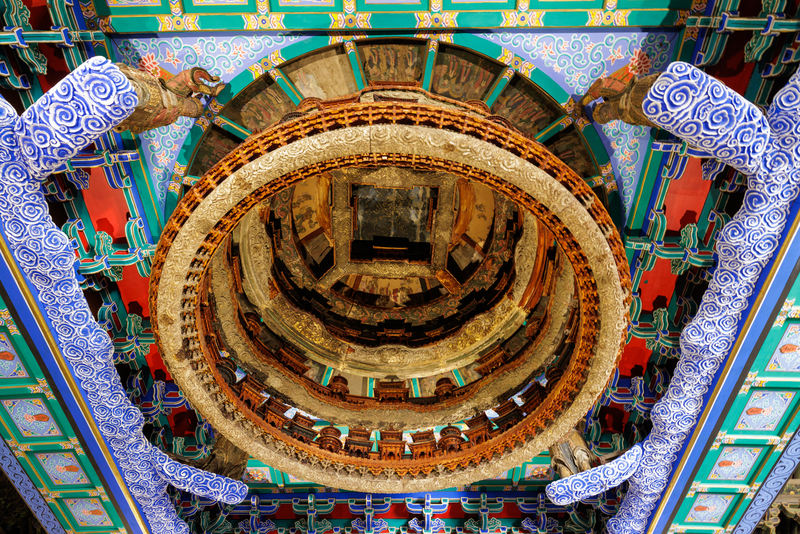 藻井是一種頂部呈穹隆狀的天花,是我國傳統(tǒng)建筑中室內(nèi)較高規(guī)格的裝修手法?!霸寰币辉~最早見于漢賦,中國古代木建筑易燃,飾以藻草寓意壓火,而井只取象形之義。它獨特的造型可以使室內(nèi)的頂部獲得最大的空間。藻井在建筑中的使用代表了尊貴與等級,一般置于寺廟所祀奉神像的頂部或?qū)m殿寶座的上方。藻井的形制有四方、八方、圓井等。