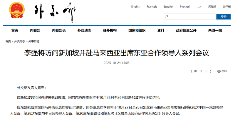 應(yīng)新加坡共和國總理黃循財邀請,國務(wù)院總理李強將于10月25日至26日對新加坡進行正式訪問。