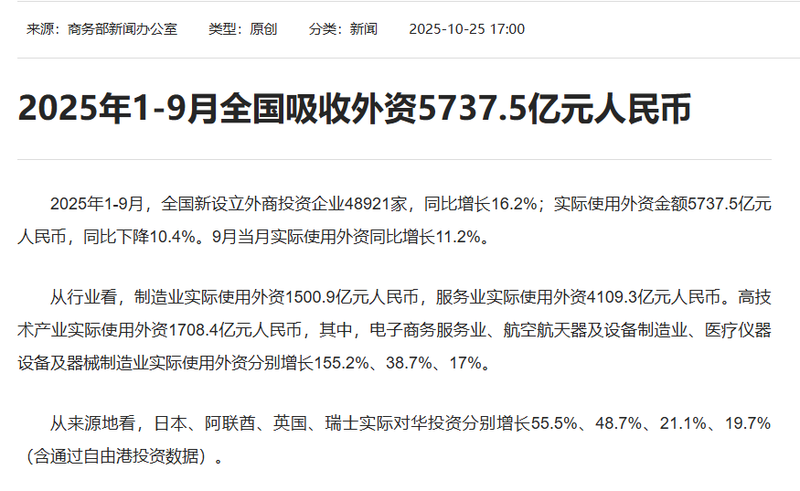 新京報(bào)訊 據(jù)商務(wù)部網(wǎng)站消息,2025年1-9月,全國新設(shè)立外商投資企業(yè)48921家,同比增長16.2%;實(shí)際使用外資金額5737.5億元人民幣,同比下降10.4%。9月當(dāng)月實(shí)際使用外資同比增長11.2%。
